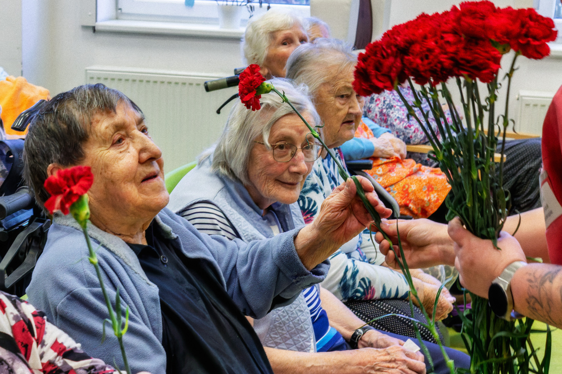 Na závěr vystoupení jsme rozdali květiny přítomným ženám a protože vždy myslíme i na ty, které se oslavy nemohou zúčastnit osobně, byly květiny během dne doručeny i ostatním uživatelkám do pokojů.