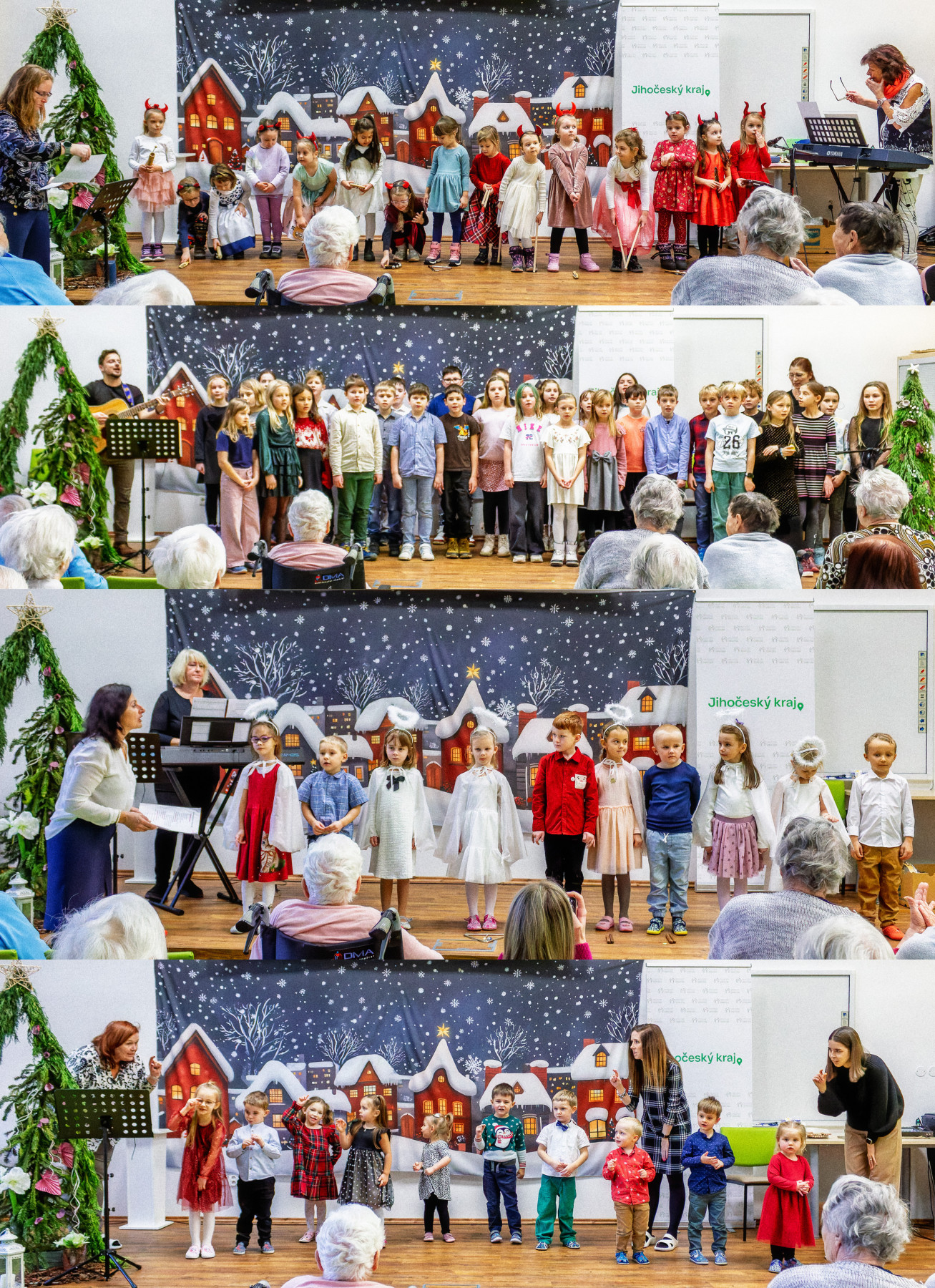Předvánoční čas je jedním z období roku, kdy náš společenský sál ožije nadprůměrným počtem účinkujících - děti ze škol přijdou provést svá nazkoušená představení k nemalé radosti našich uživatelů. Ve čtvrtek 11. prosince se tak u nás sešlo bezmála osmdesát žáků ve čtyřech skupinách: ze Základní školy Dobrá Voda, z Mateřské školy Dobrá Voda, z Mateřské školy Jizerská a nesměly chybět ani Rybičky - dětská skupina pro děti našich zaměstnanců.